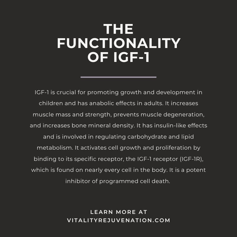 IGF-1 (Insulin-like Growth Factor 1) is produced in response to growth hormone release and plays a key role in tissue repair, cellular growth, and regeneration. Its longer half-life allows for more sustained effects compared to growth hormone alone.